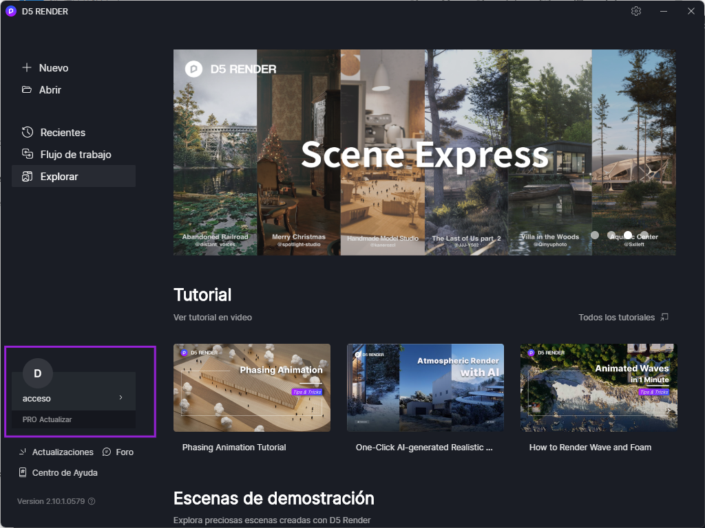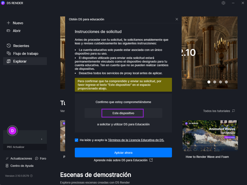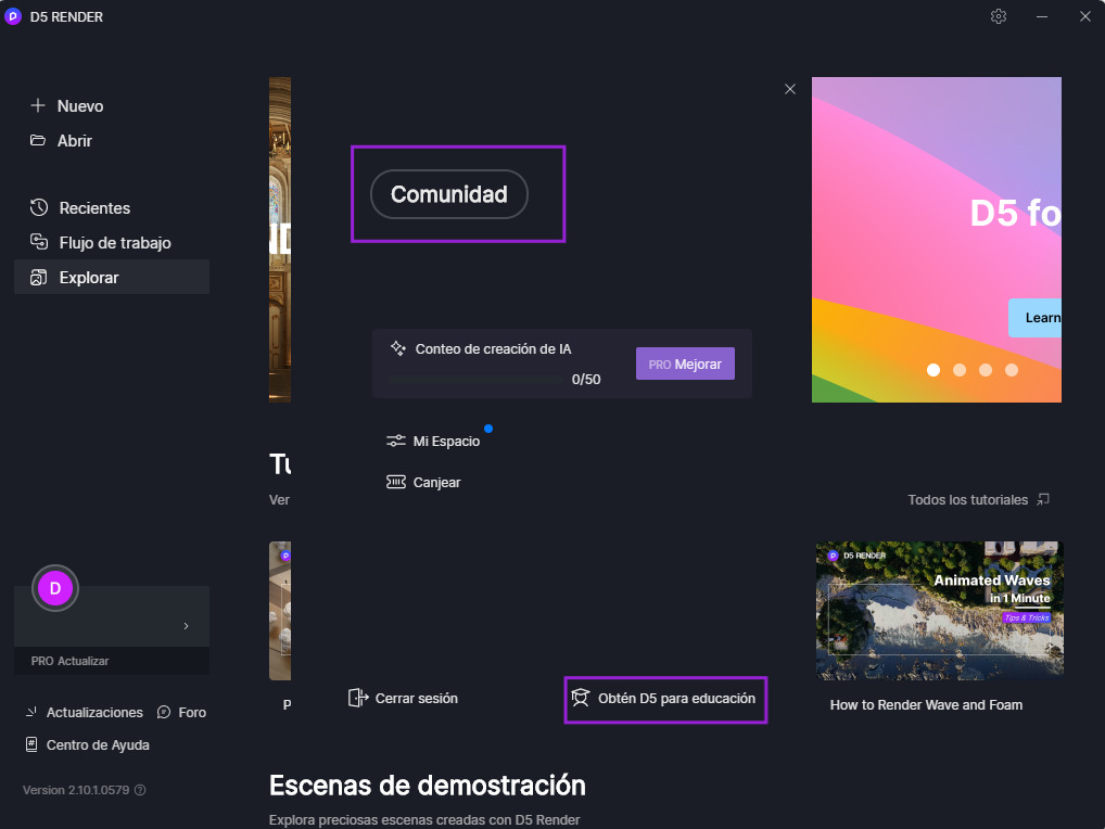 Ten en cuenta que solo una cuenta D5 Community puede solicitar la licencia educativa de D5. Para verificar si tu cuenta es D5 Pro (suscrita o regalado).