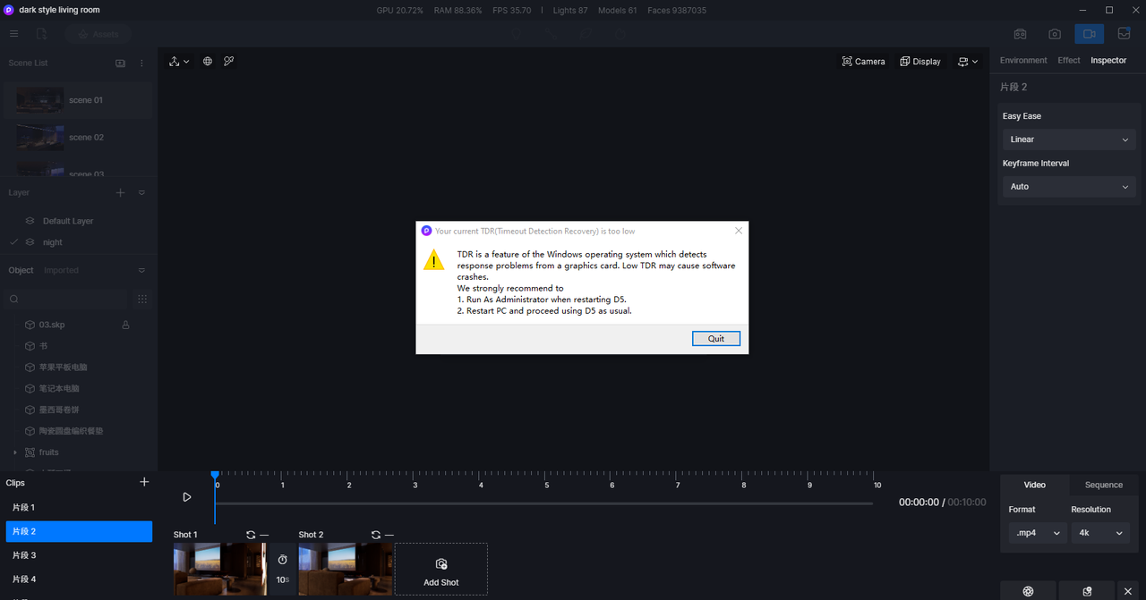 Most users of graphics software may have once seen a notification which warns that the computer's TDR delay value is too low. It is also likely to pop up when you render high-resolution images or videos in D5 Render.